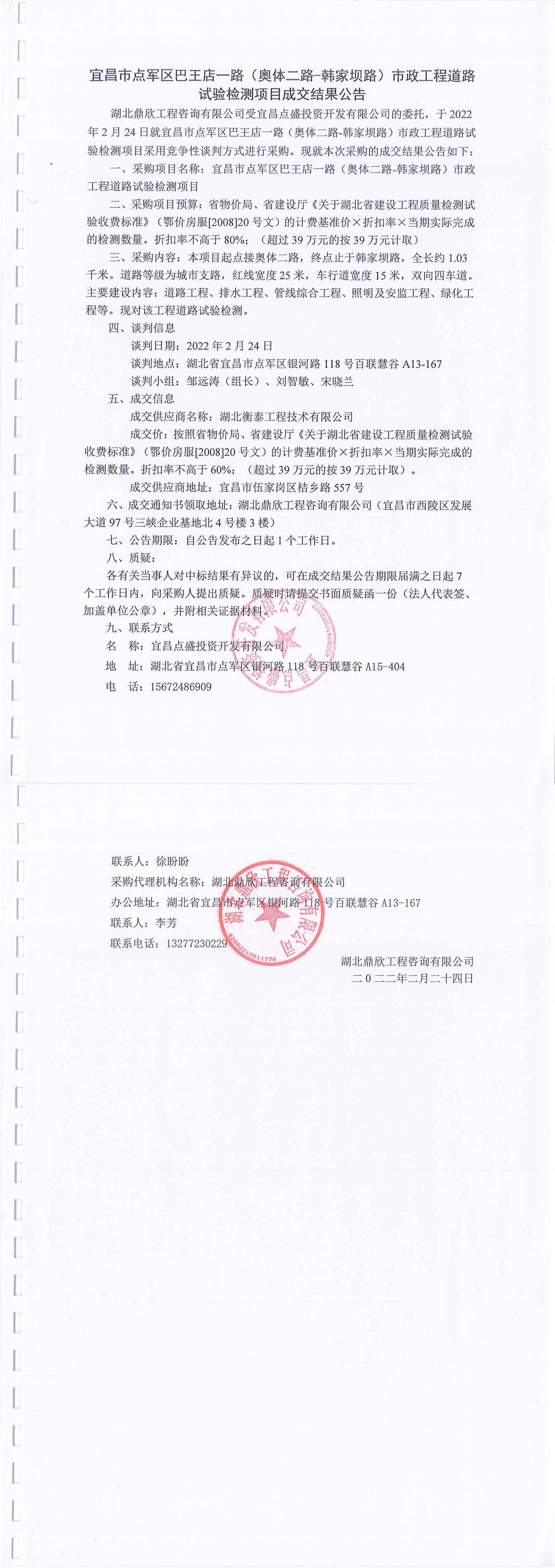 宜昌市點軍區(qū)巴王店一路(奧體二路-韓家壩路)市政工程道路試驗檢測項目成交公告