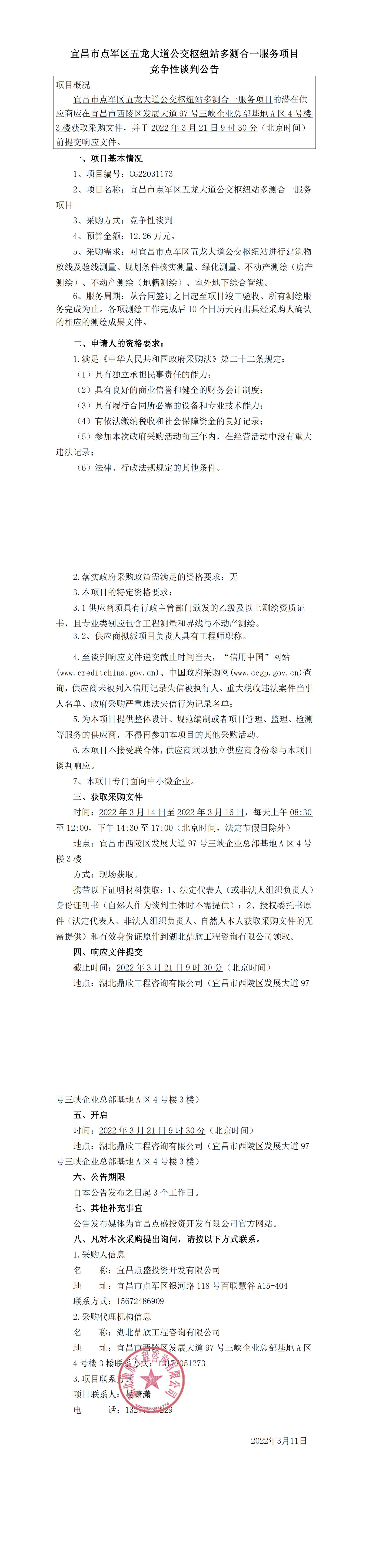 宜昌市點軍區(qū)五龍大道公交樞紐站多測合一服務項目競爭性談判公告