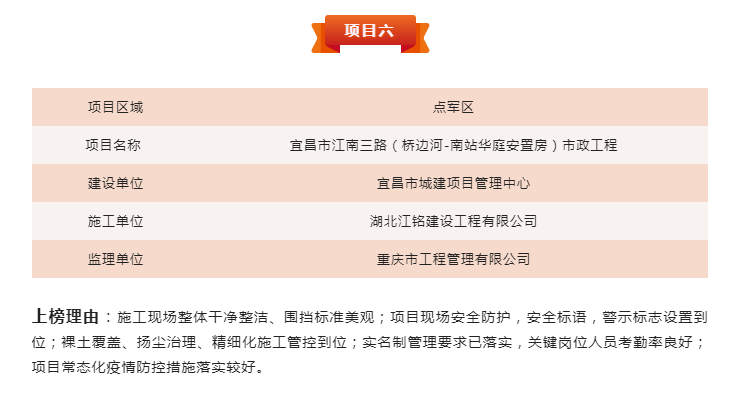 (通訊員:徐文剛、吳鵬翔)為進一步貫徹落實《宜昌市揚塵污染防治條例》《宜昌市城區(qū)建設(shè)工程文明施工管理紅黑榜制度(試行)》,強化建筑工地文明施工管理,壓實建設(shè)單位文明施工主體責任,鼓勵文明施工先進典型,打擊和曝光不文明施工違法行為,結(jié)合建筑工地實名制管理、關(guān)鍵崗位人員到崗履職相關(guān)要求,宜昌市住建局組織評選了2022年第七期建筑工程安全文明施工管理“紅黑榜”。點盛投資開發(fā)有限公司代建項目江南三路,成為點軍區(qū)唯一獲評紅榜的市政項目。