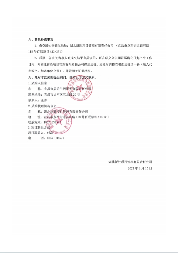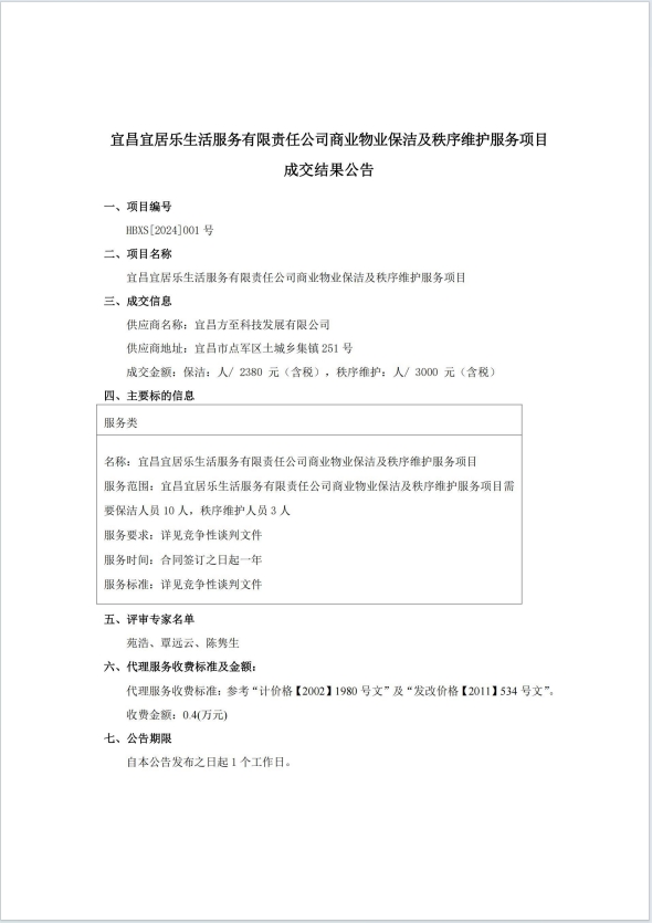 宜昌宜居樂生活服務(wù)有限責(zé)任公司商業(yè)物業(yè)保潔及秩序維護(hù)服務(wù)項目成交結(jié)果公告