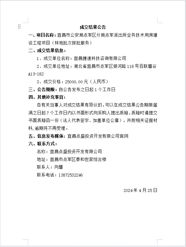 宜昌市公安局點(diǎn)軍區(qū)分局點(diǎn)軍派出所業(yè)務(wù)技術(shù)用房建設(shè)工程項目 (林地批次報批服務(wù))成交公告