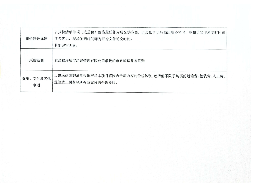 宜昌鑫澤城市運營管理有限公司市政維修人行道井蓋采購項目詢價公告