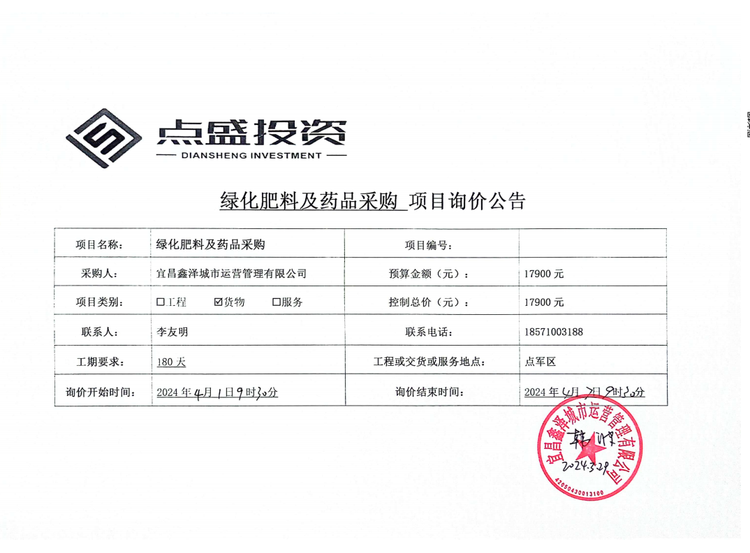 宜昌鑫澤城市運(yùn)營(yíng)管理有限公司綠化肥料及藥品采購(gòu)項(xiàng)目詢價(jià)公告