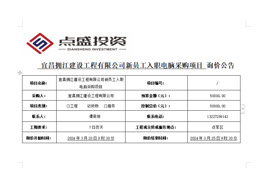 宜昌擁江建設(shè)工程有限公司新員工入職電腦采購項目詢價公告