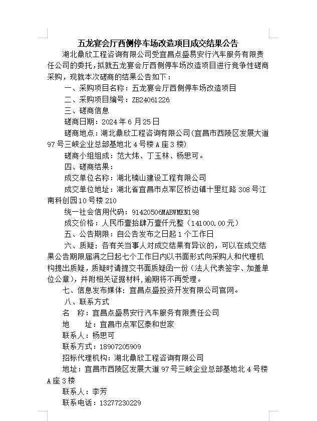 五龍宴會(huì)廳西側(cè)停車(chē)場(chǎng)改造項(xiàng)目成交結(jié)果公告