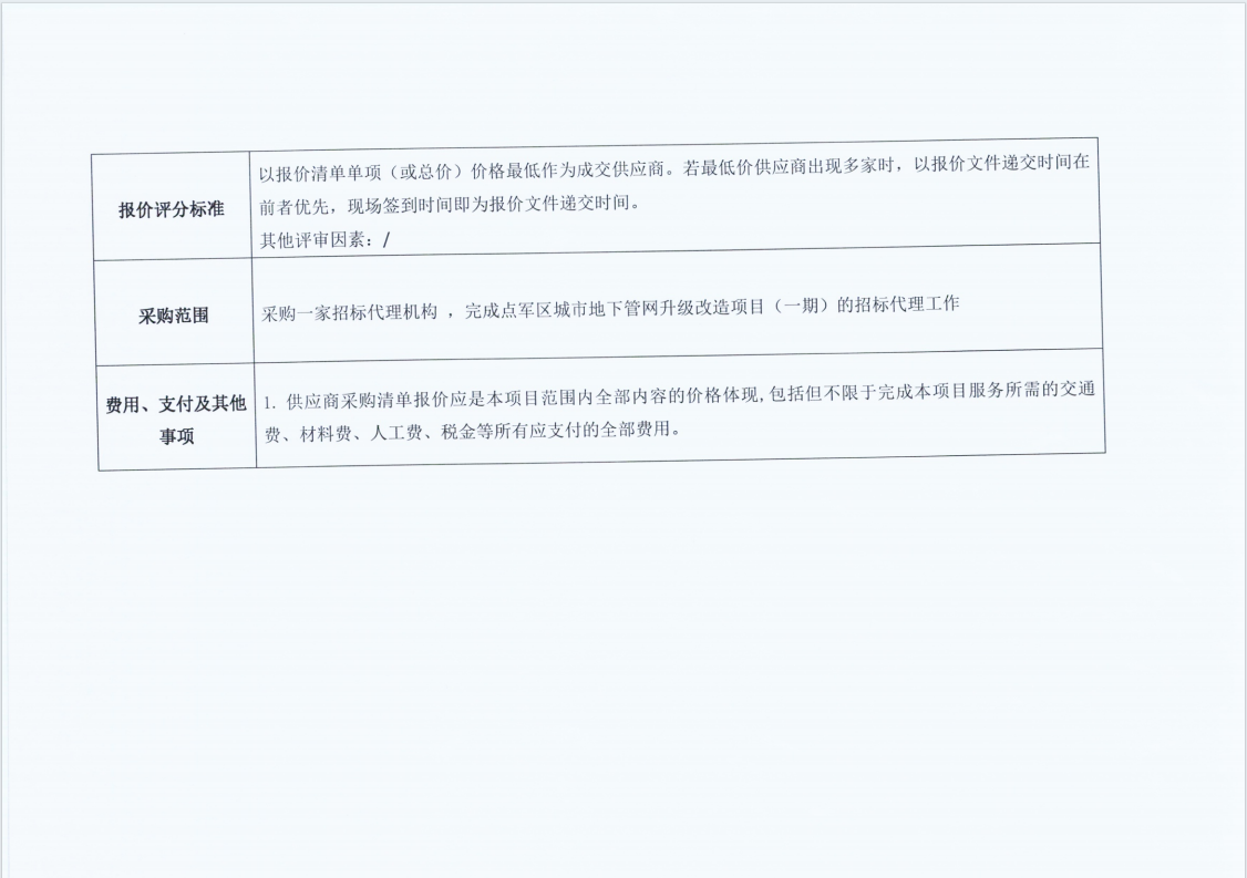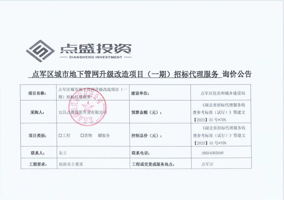 點(diǎn)軍區(qū)城市地下管網(wǎng)升級改造項(xiàng)目(一期)招標(biāo)代理服務(wù) 詢價公告