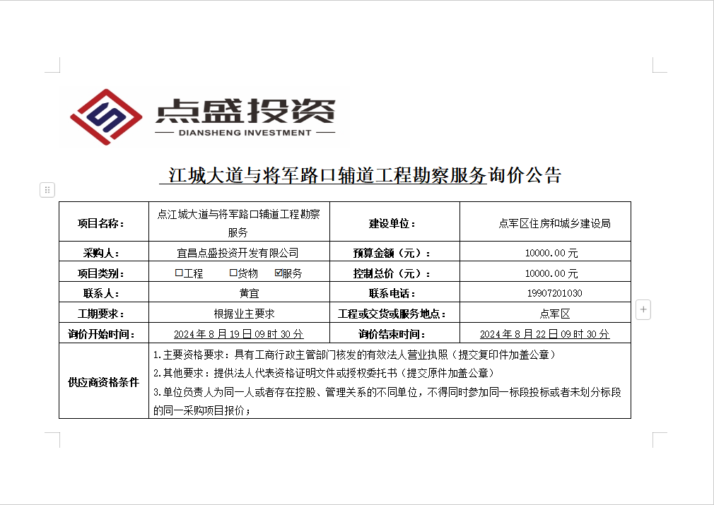 江城大道與將軍路口輔道工程勘察服務(wù)詢價(jià)公告