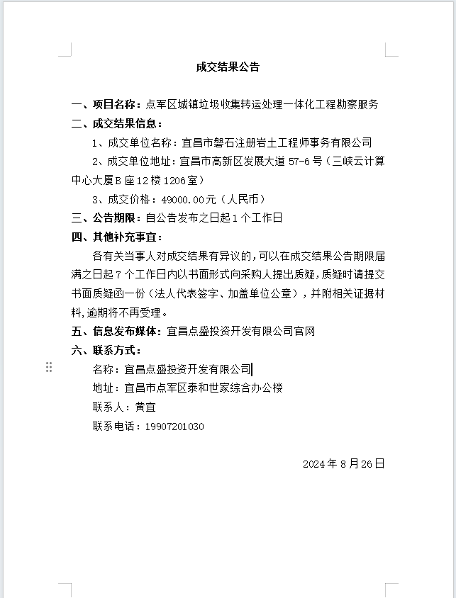 點軍區(qū)城鎮(zhèn)垃圾收集轉(zhuǎn)運(yùn)處理一體化工程勘察服務(wù)成交公告