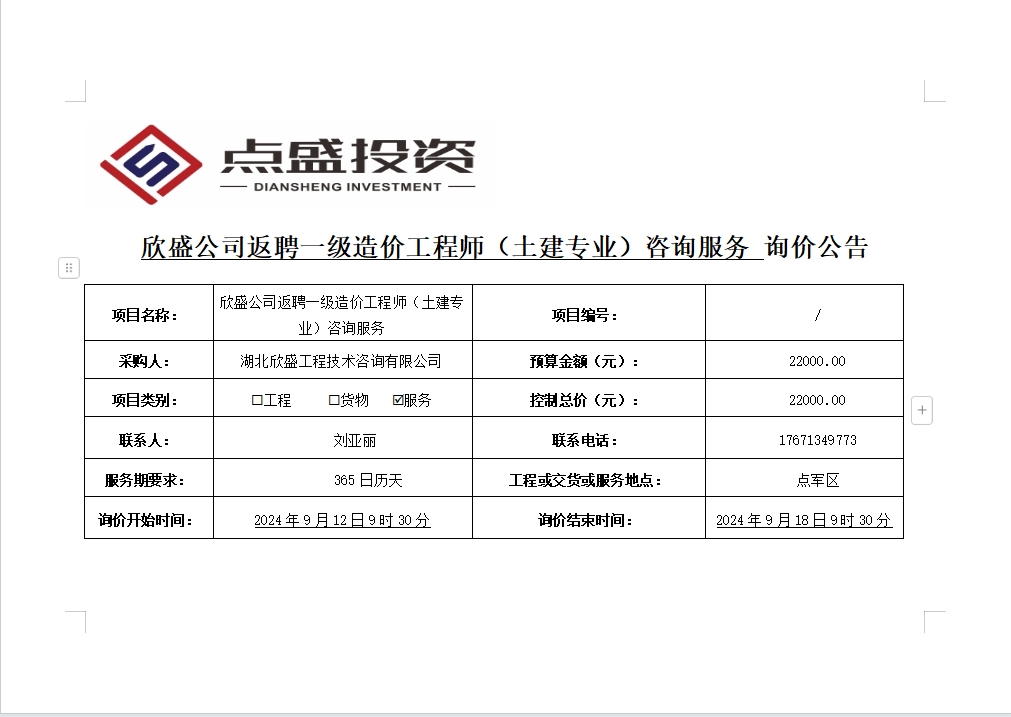 欣盛公司返聘一級造價工程師(土建專業(yè))咨詢服務詢價公告