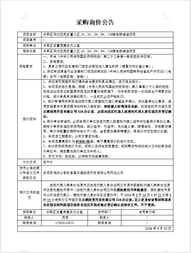 點軍區(qū)陽光花苑安置小區(qū)1#、3#、8#、9#、13#樓電梯維修項目詢價公告