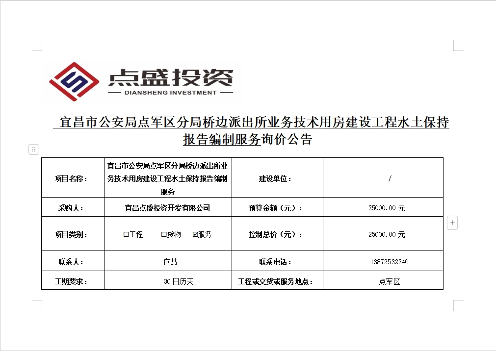 宜昌市公安局點軍區(qū)分局橋邊派出所業(yè)務技術(shù)用房建設工程水土保持報告編制服務詢價公告