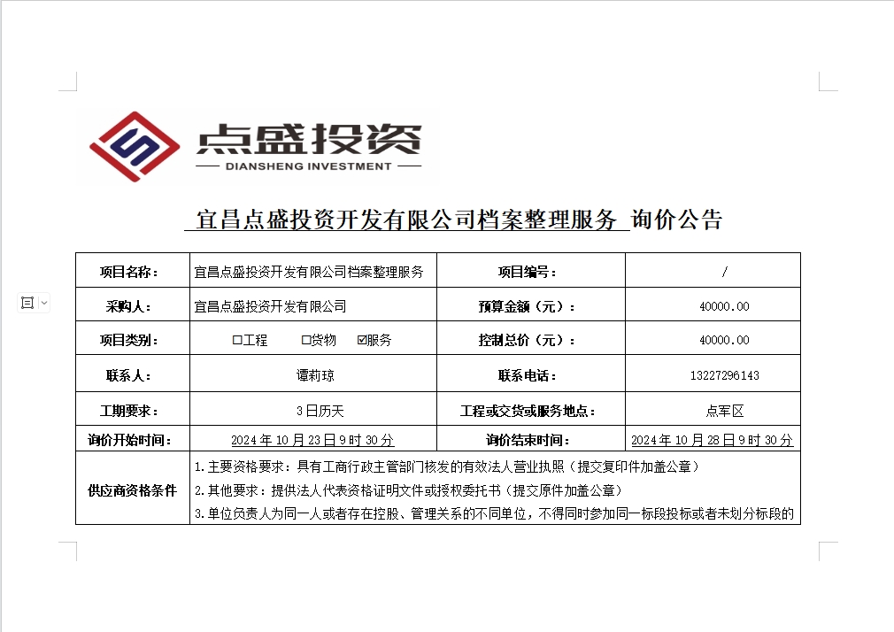 宜昌點(diǎn)盛投資開(kāi)發(fā)有限公司檔案整理服務(wù)詢(xún)價(jià)公告