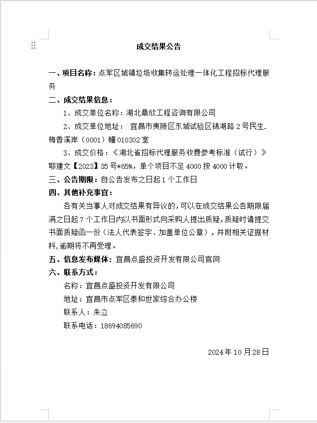 點軍區(qū)城鎮(zhèn)垃圾收集轉(zhuǎn)運處理一體化工程 招標(biāo)代理服務(wù)成交公告