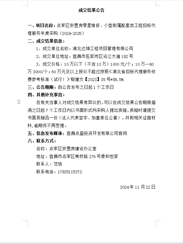 點(diǎn)軍區(qū)安置房零星維修、小型附屬配套類工程招標(biāo)代理服務(wù)年度采購(2024-2025)成交公告
