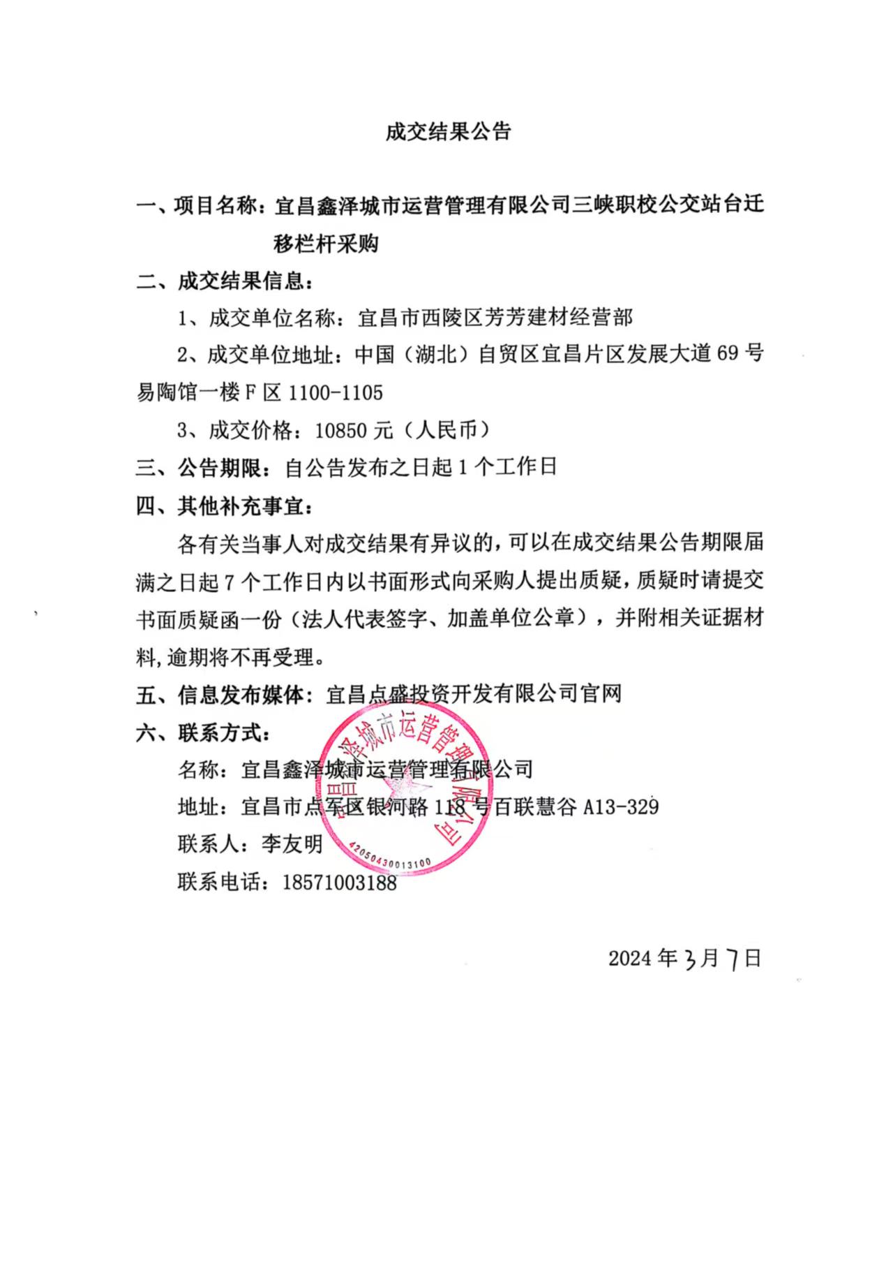 三峽職校公交站臺(tái)遷移欄桿采購成交公告