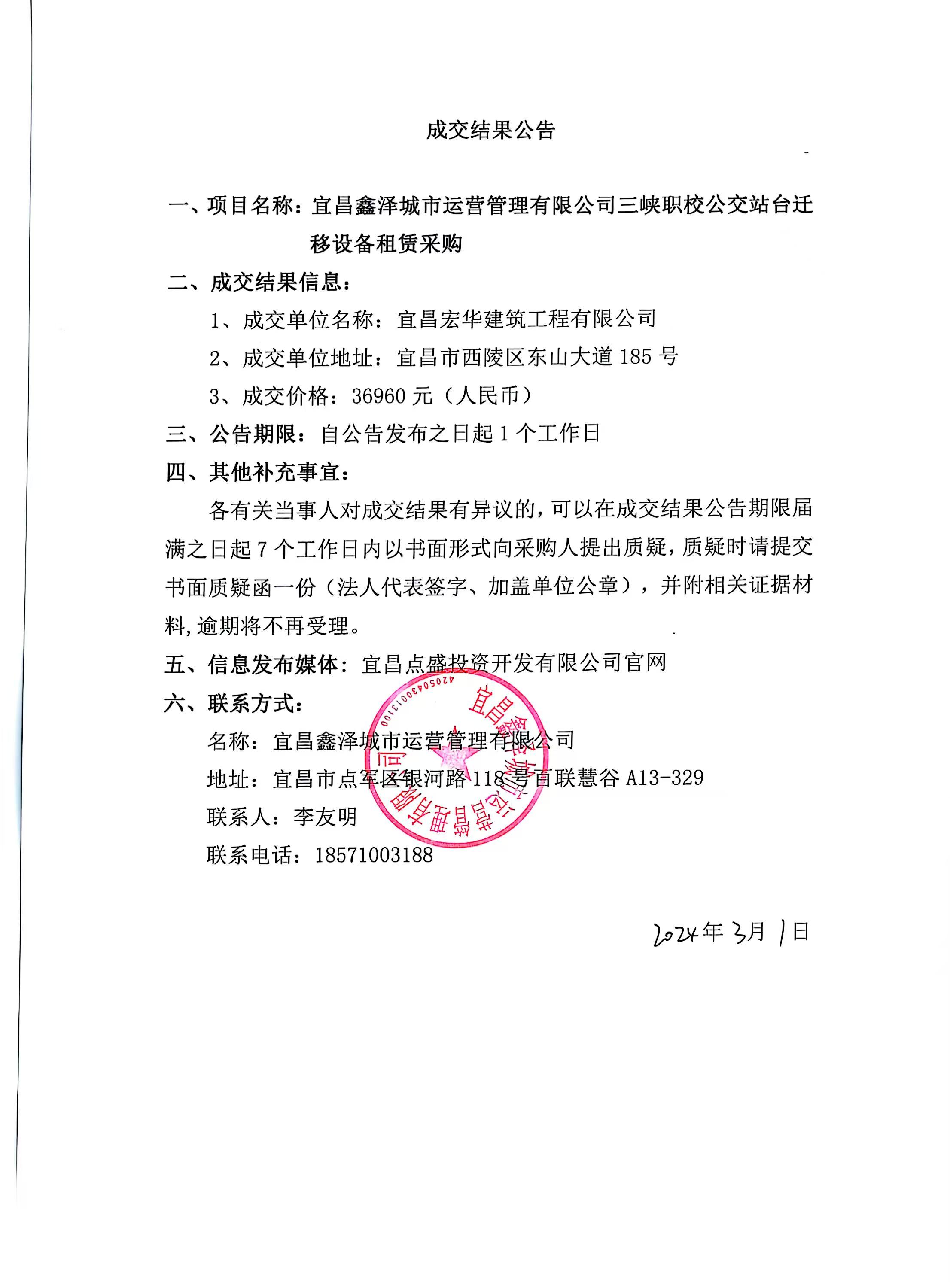 三峽職校公交站臺遷移項目設(shè)備租賃采購成交公告